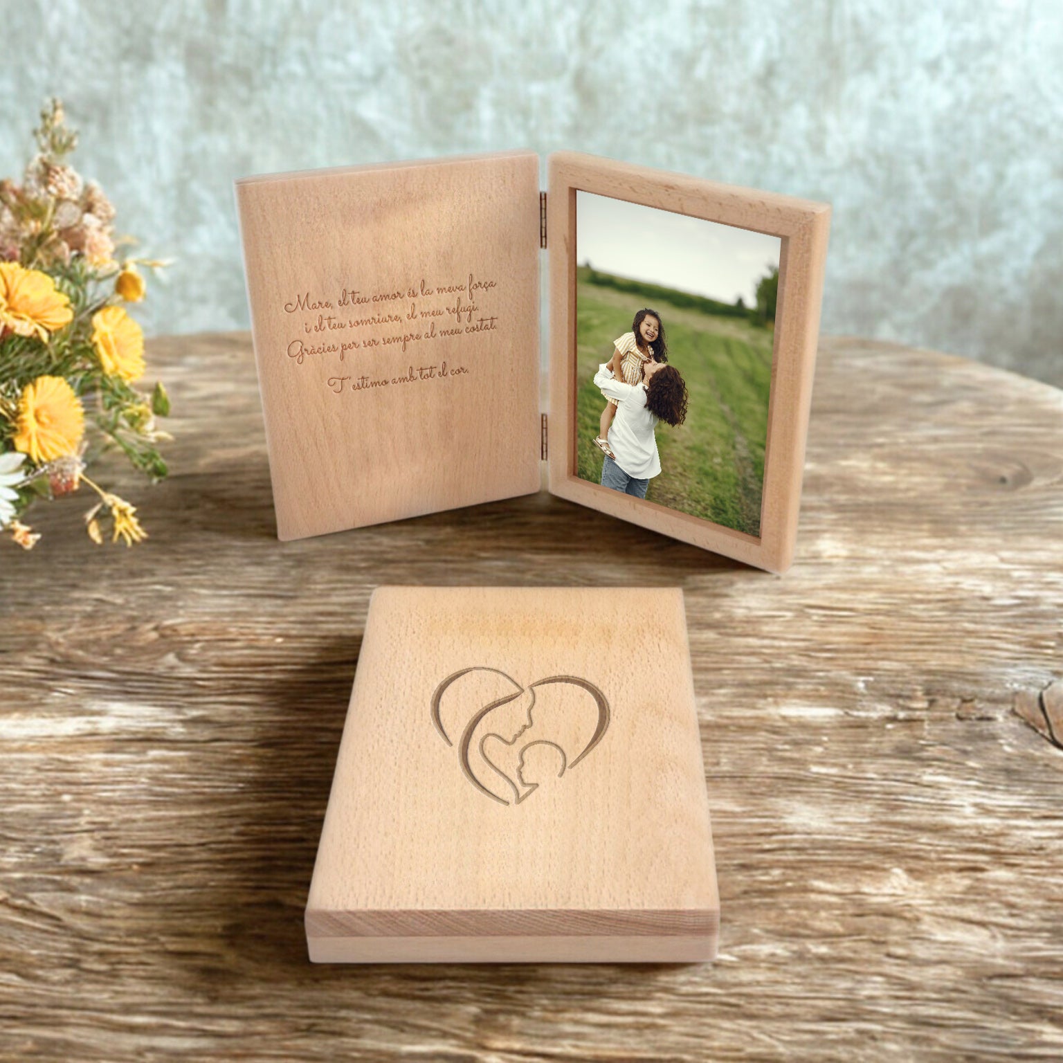 La gran diferencia está en la personalización: puedes añadir en la portada un nombre, una fecha, una frase emotiva o un diseño grabado a láser con la máxima precisión. Así, cada marco se convierte en un detalle exclusivo y con alma. Ideal para el Día de la Madre, aniversarios, bodas, comuniones o cualquier ocasión especial.