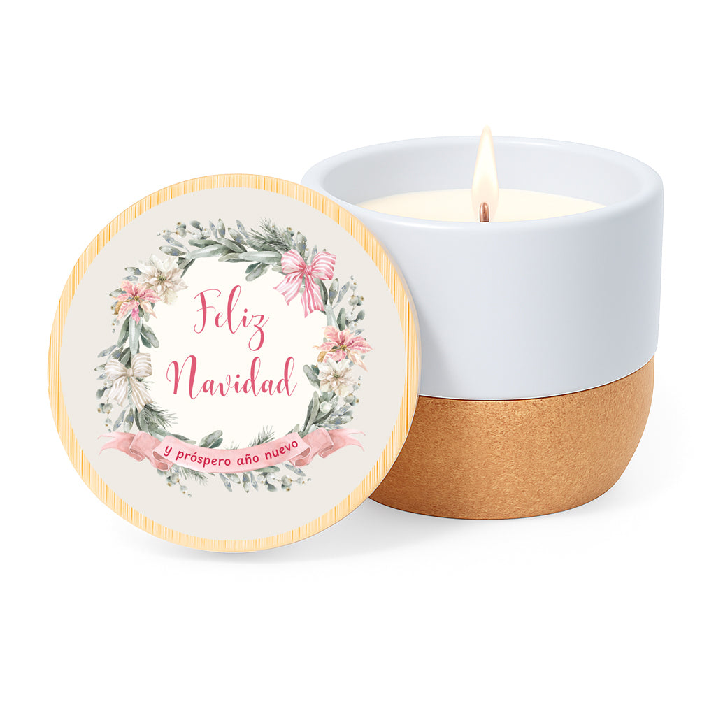 El mensaje más tradicional, con un diseño cuidado y encantador. Viene en un tarro de cerámica blanca con base de corcho natural y tapa de bambú impresa a todo color, todo acompañado de una fragancia suave a lino. Ideal para regalar y llenar el hogar de luz y buenos deseos.